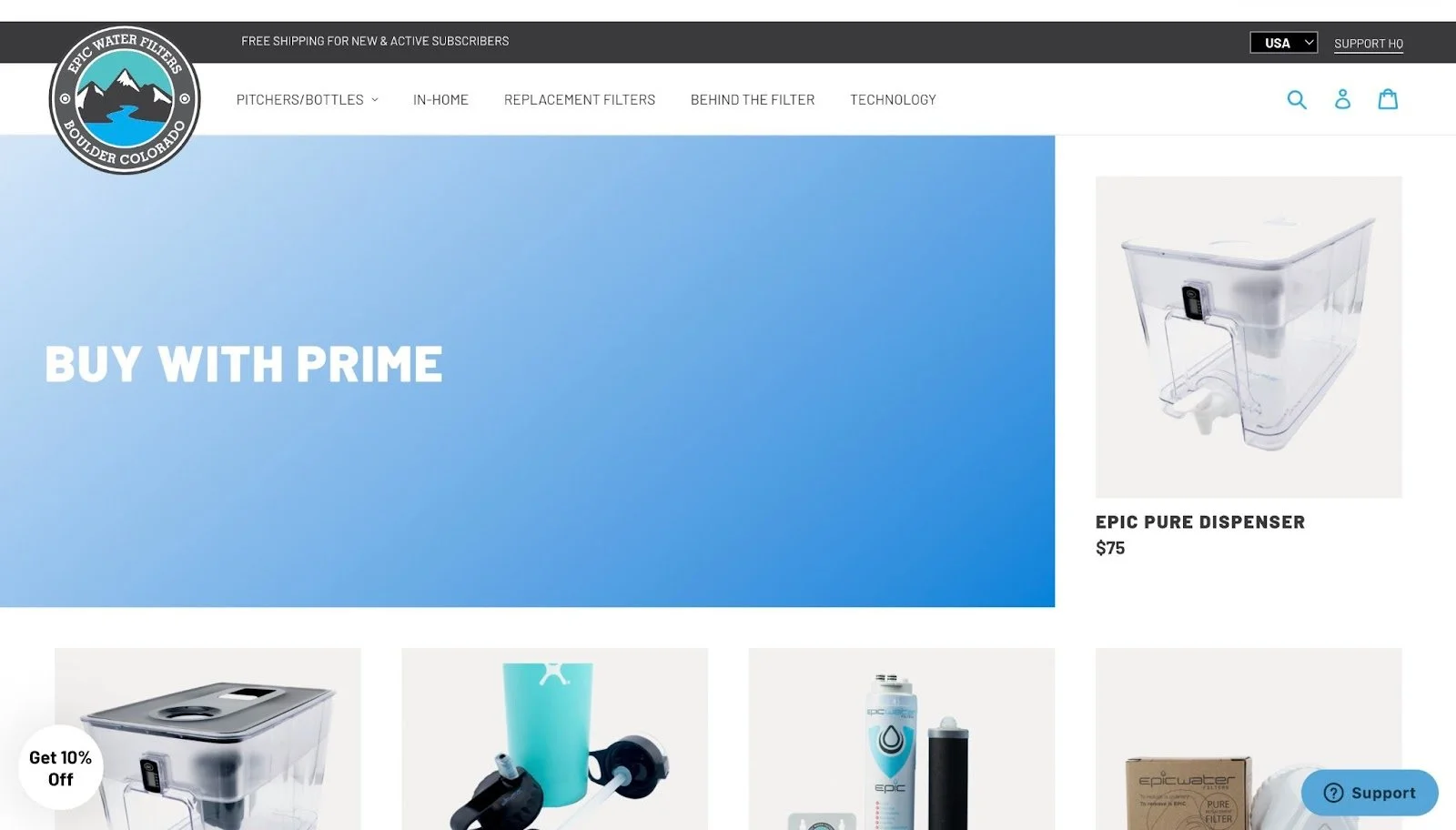 Epic Water Filters. They have a page specifically for Buy With Prime products and each product page includes the buy with prime button. It’s easy to find the buy with prime page since it is listed on the drop down menu of the navigation bar.