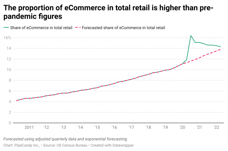 Of course, the pandemic changed a lot of things. The end of the pandemic changed even more as it became clear that Shopify became slightly unfocused, bloated, and overstaffed. eCommerce is now back to its pre-pandemic growth trajectory.